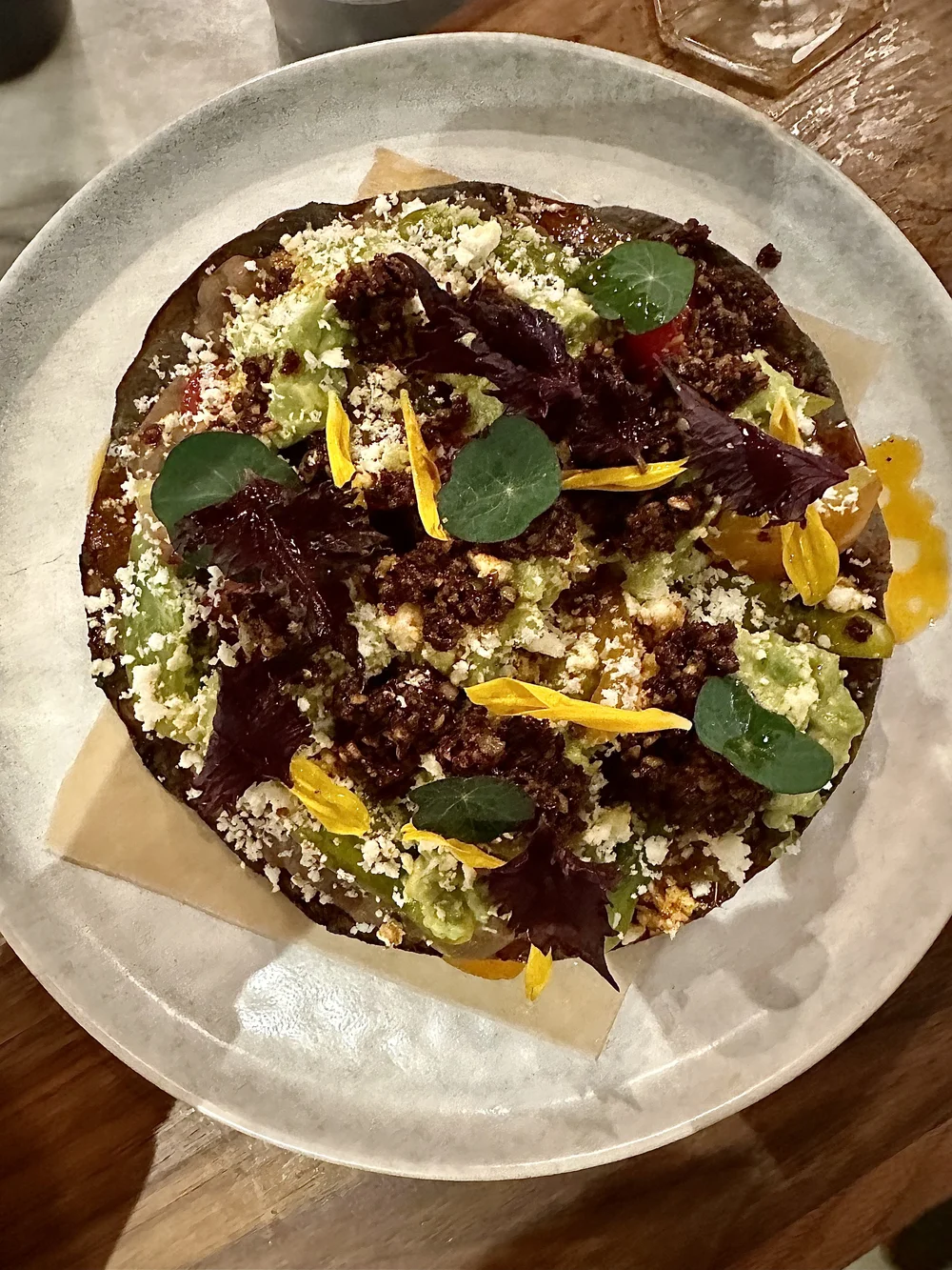 Lilia Comedor | Zebra Tomato Tlayuda | Braised Pinot Beans + Crushed Avocado + Macha Roja + Cotija Enchilado