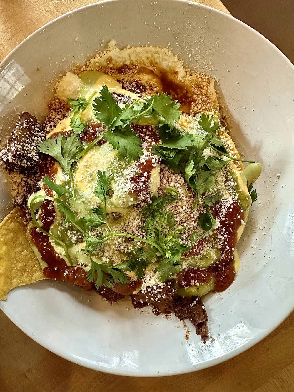 Cafe Rowan | Chable’s Birria Rancheros | Beef Birria + Sunnyside Eggs + Fried Yellow Corn Tortillas + Cilantro Lime Crema + Aji Amarillo Crema + Salsa Verde + Salsa Rojo + Cotija Cheese