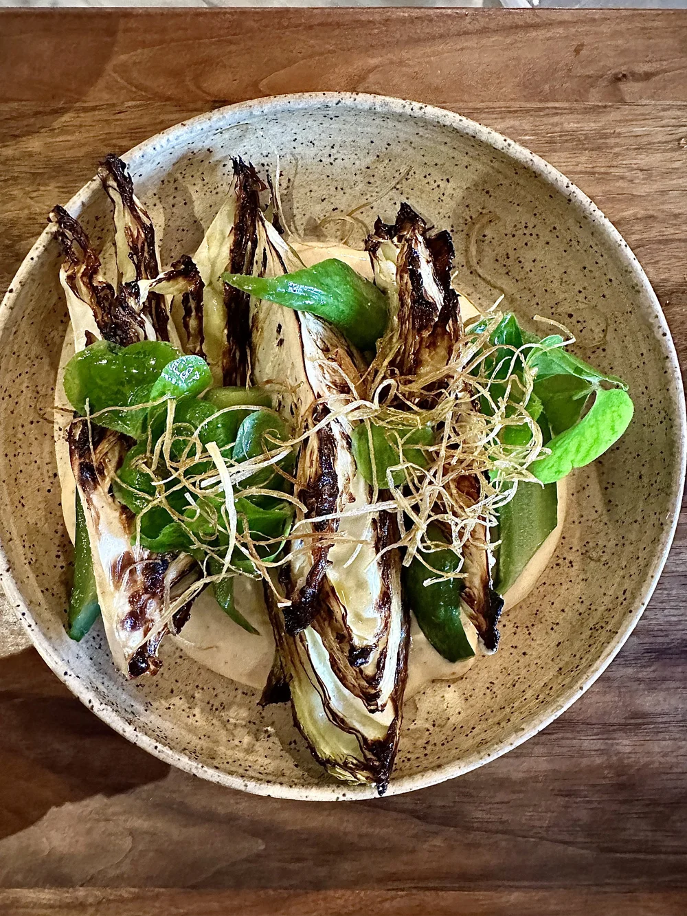 Lilia Comedor | Cabbage a la Brasa | Chipotle Buttermilk + Pickled Cucumber + Crispy Leek